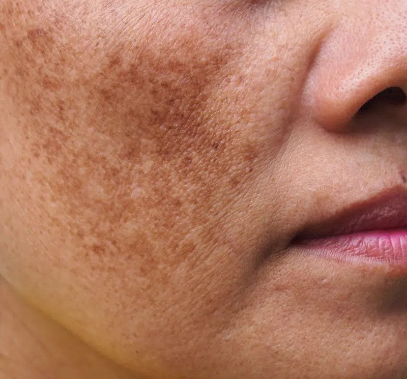 Les taches pigmentaires apparaissent principalement sur les zones exposées au soleil (visage, décolleté, mains) et donnent à la peau une apparence vieillie.